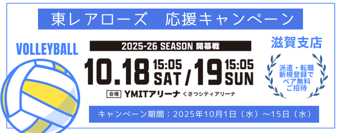 対象者 | <対象となる方> *キャンペーン期間内に、東レエンタープライズ滋賀支店にご登録が可能な方 *事務・営業・製造(組立・検査)・研究などの実務経験が1年以上またはブランクが2年以内の方 *長期での就業が可能な方 *2026年3月末までに就業が可能な方 |